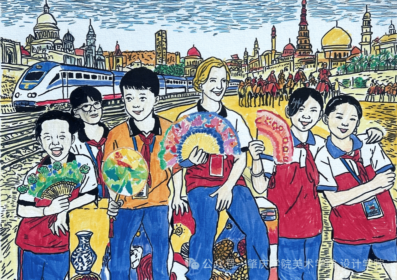 展览方面,我院配合学校统筹推进,由吴君茹老师具体指导,联动鼎湖区凤凰学校(“双百行动”项目)、四会市黄田学校、龙湾学校(“美育浸润”项目)以及云浮市云城区思劳镇中心小学、腰古镇中学(“三所学校”项目)共5所合作学校开展主题创作。师生围绕“利玛窦”“中欧班列”“丝绸之路”“中外少年儿童”四大主题,累计创作作品130幅。经评选,每校各有一幅作品入选全球首展线下单元。